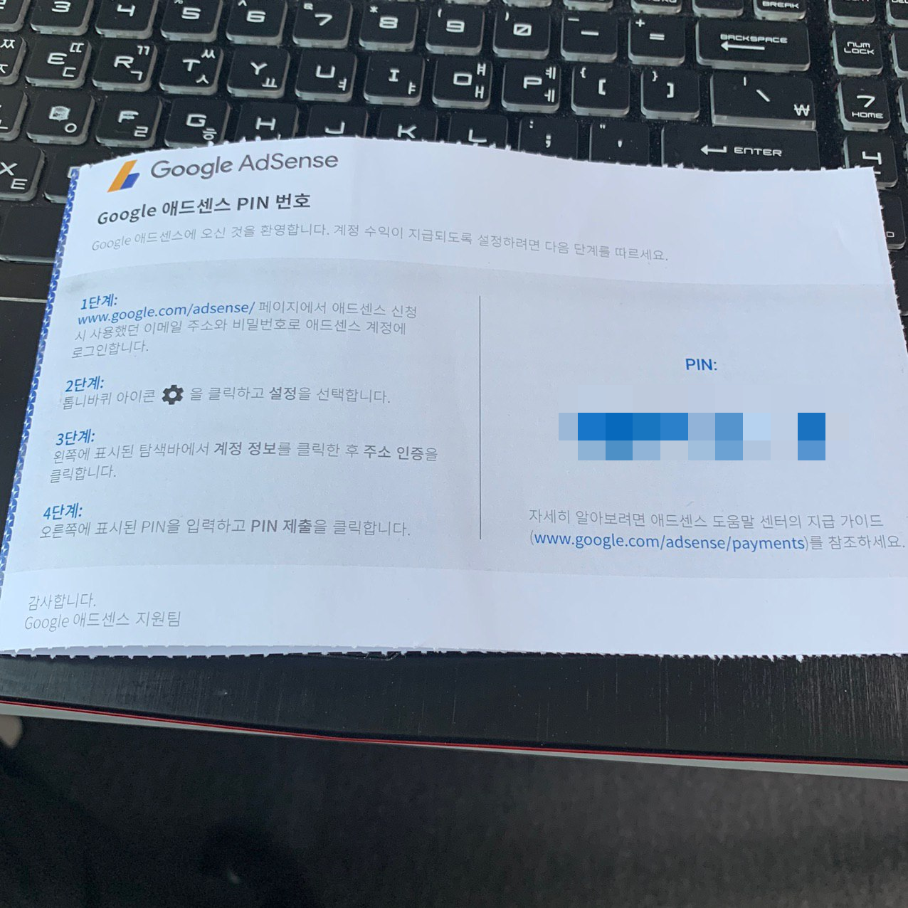 우편에 있는 핀번호를 구글 애드센스 지급 메뉴에서 입력하고 아래의 제출 버튼을 누르면