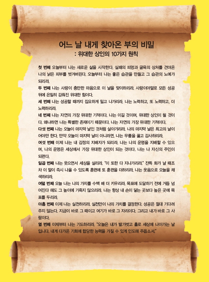 풀과 나무는 자연의 날씨에 좌우되지만, 나는 내 감정의 날씨를 나 스스로 만들고 이를 다른 사람에게 전하게 된다. 내가 고객들을 무뚝뚝함과 우울함, 어두움과 찌푸림으로 대한다면 그들 역시 무뚝뚝함과 우울함, 어두움과 찌푸림으로 반응하게 될 것이고, 아무 물건도 사지 않을 것이다.