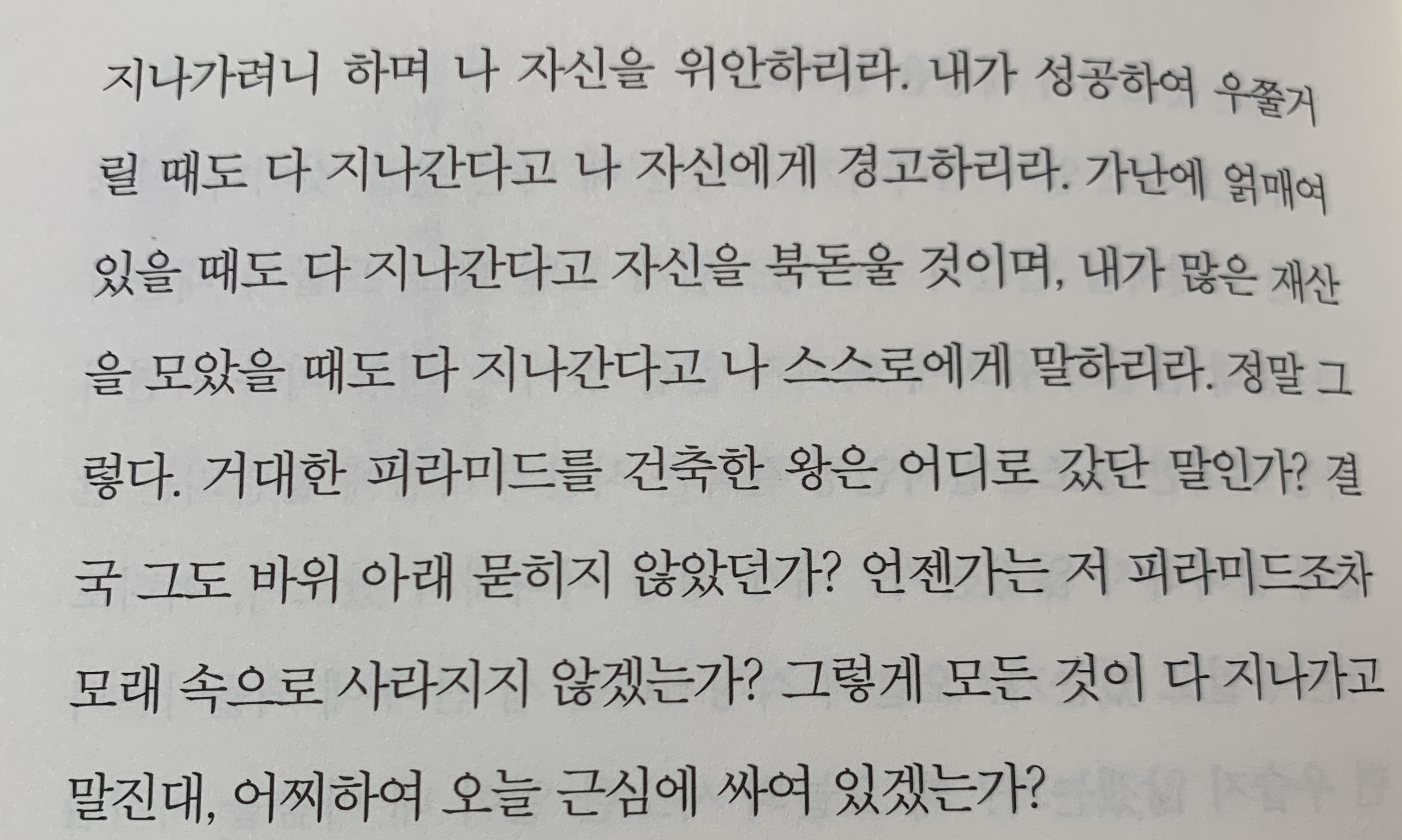 내가 비록 자연의 가장 위대한 창조물일지언정 결국은 시간의 바람에 흩날리는 낟알에 불과하지 않겠는가? 내가 정년 어디에서 왔으며, 어디로 가는지 알고 있는가? 오늘의 걱정거리를 십 년 후에 되돌아본다면 우습지 않겠는가? 왜 오늘의 사소한 일이 내 마음을 어지럽히게 내버려두는가?
